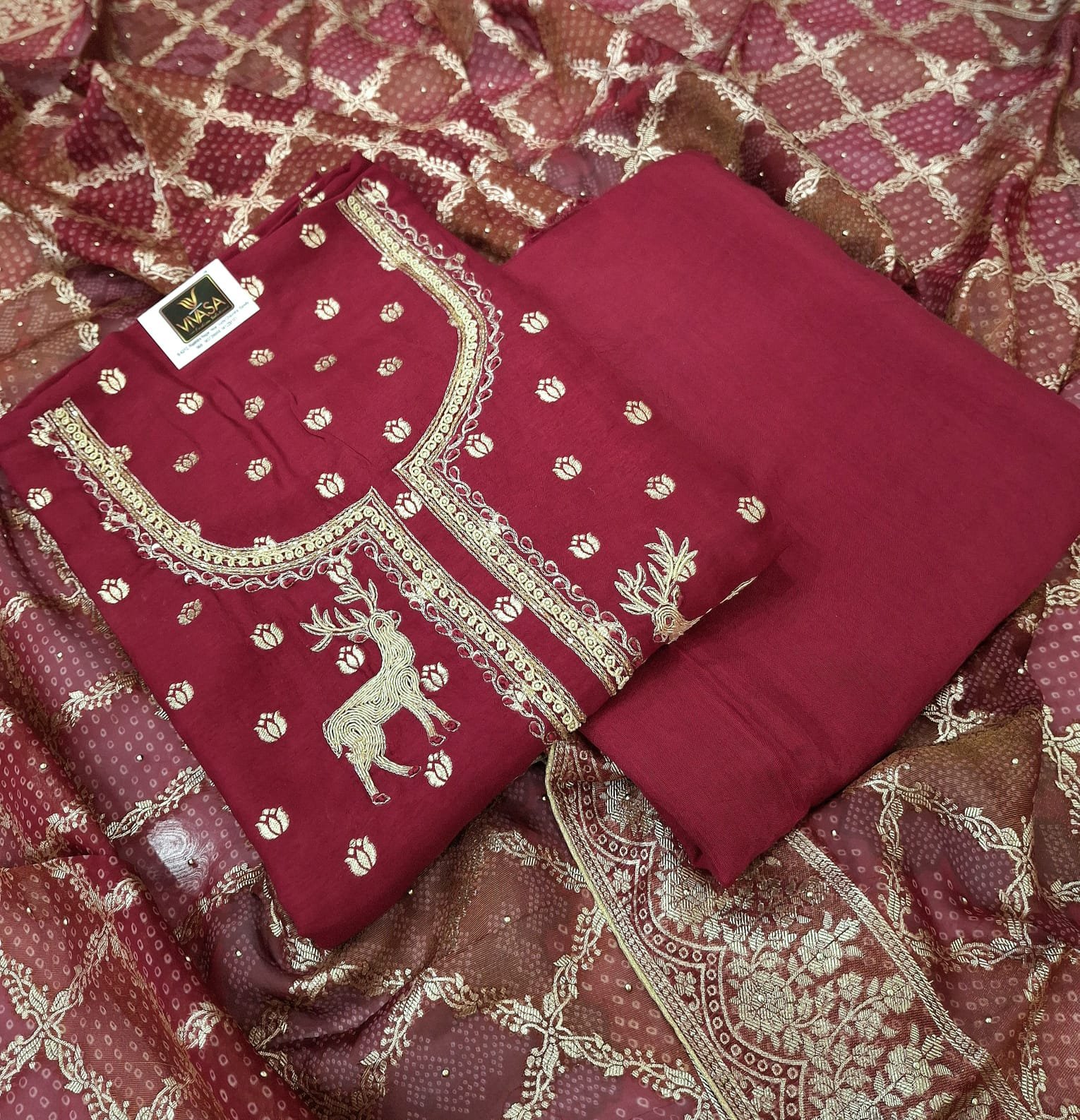 Pure silk fabric figure embroidery design & hand work neck with plane bottom & designer khaddi work silk dupatta.