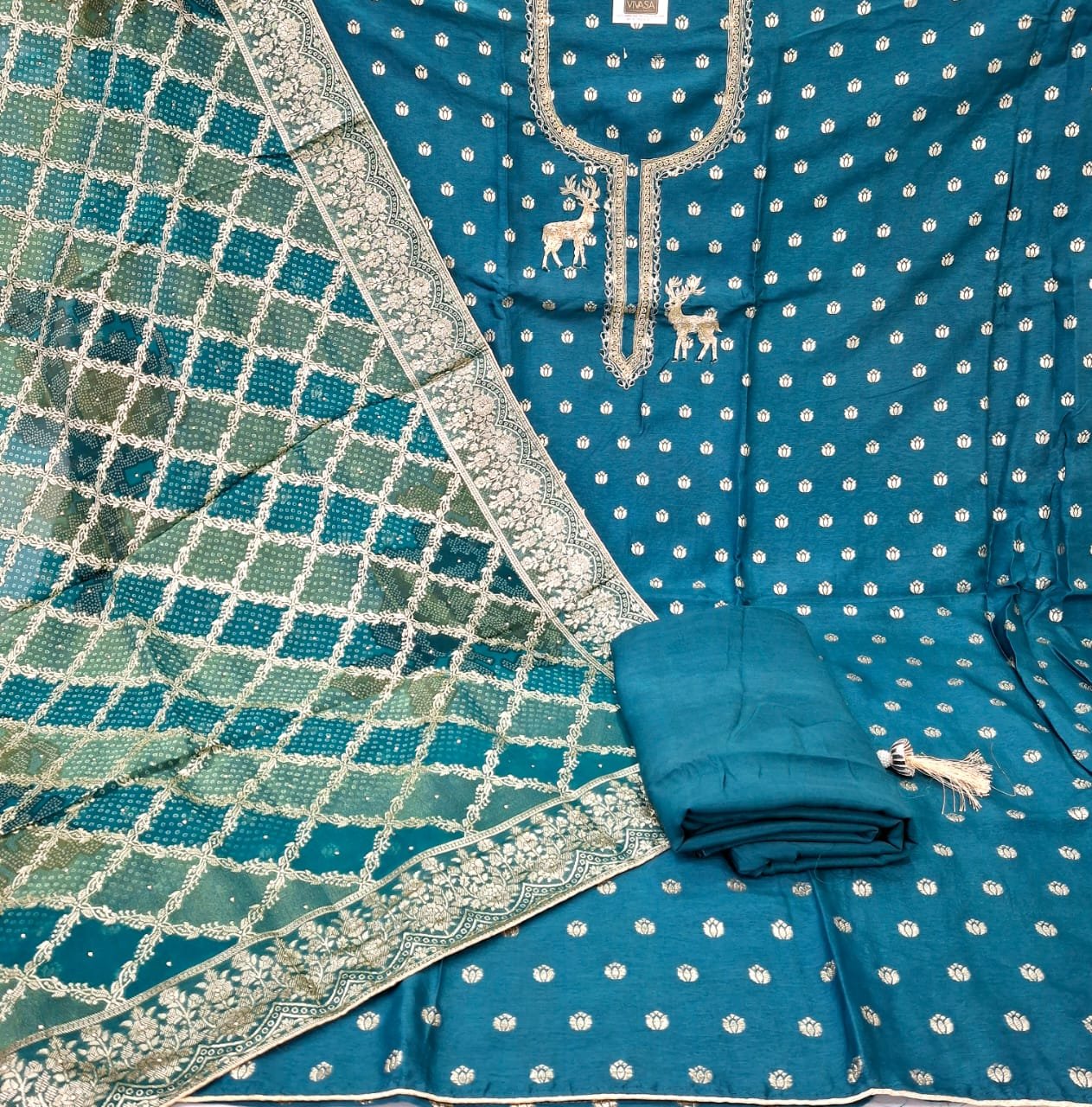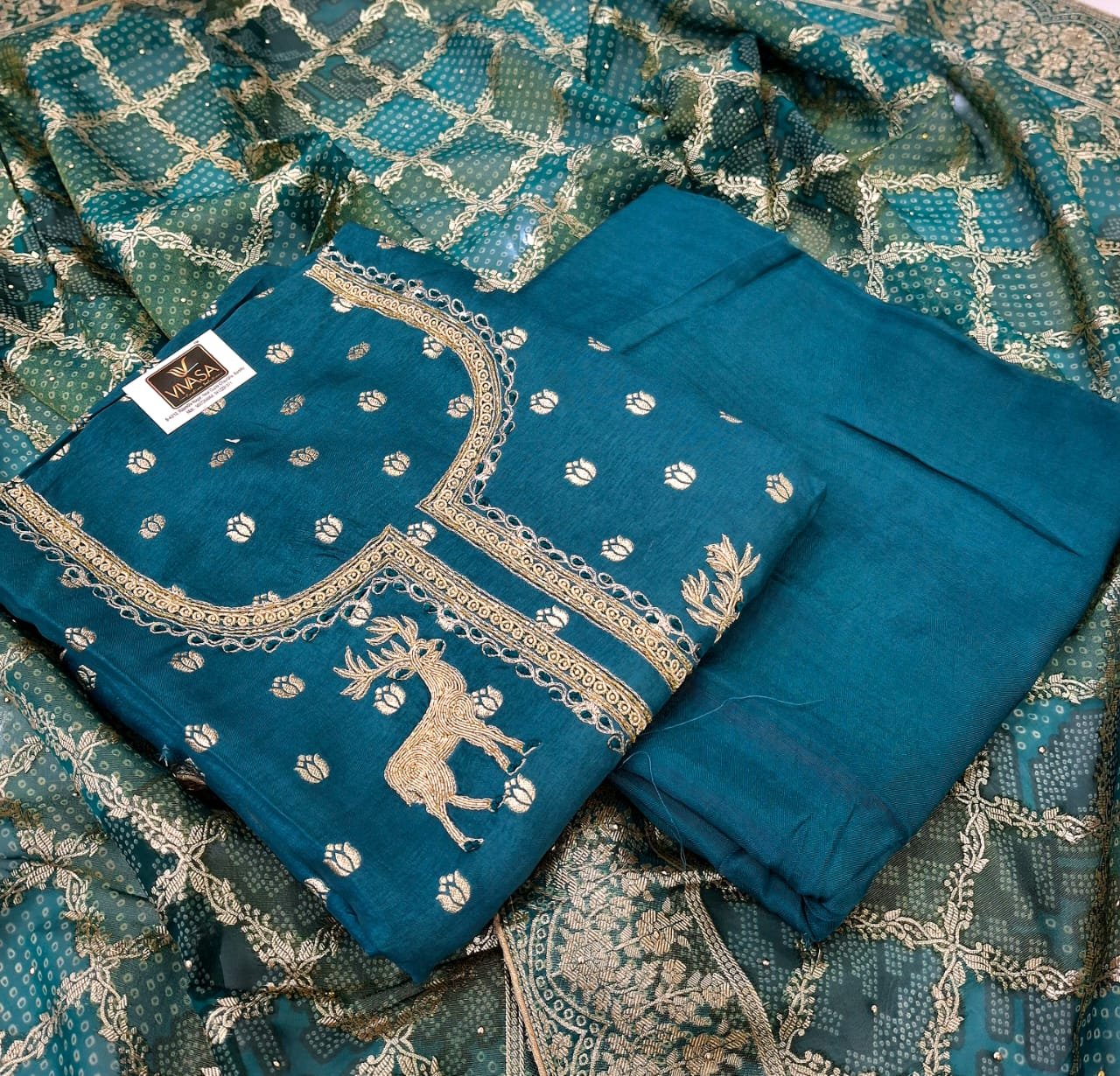 Pure Silk fabric neck kundan embroidery work and hand embroidery work suit with silk dupatta and plane bottom.