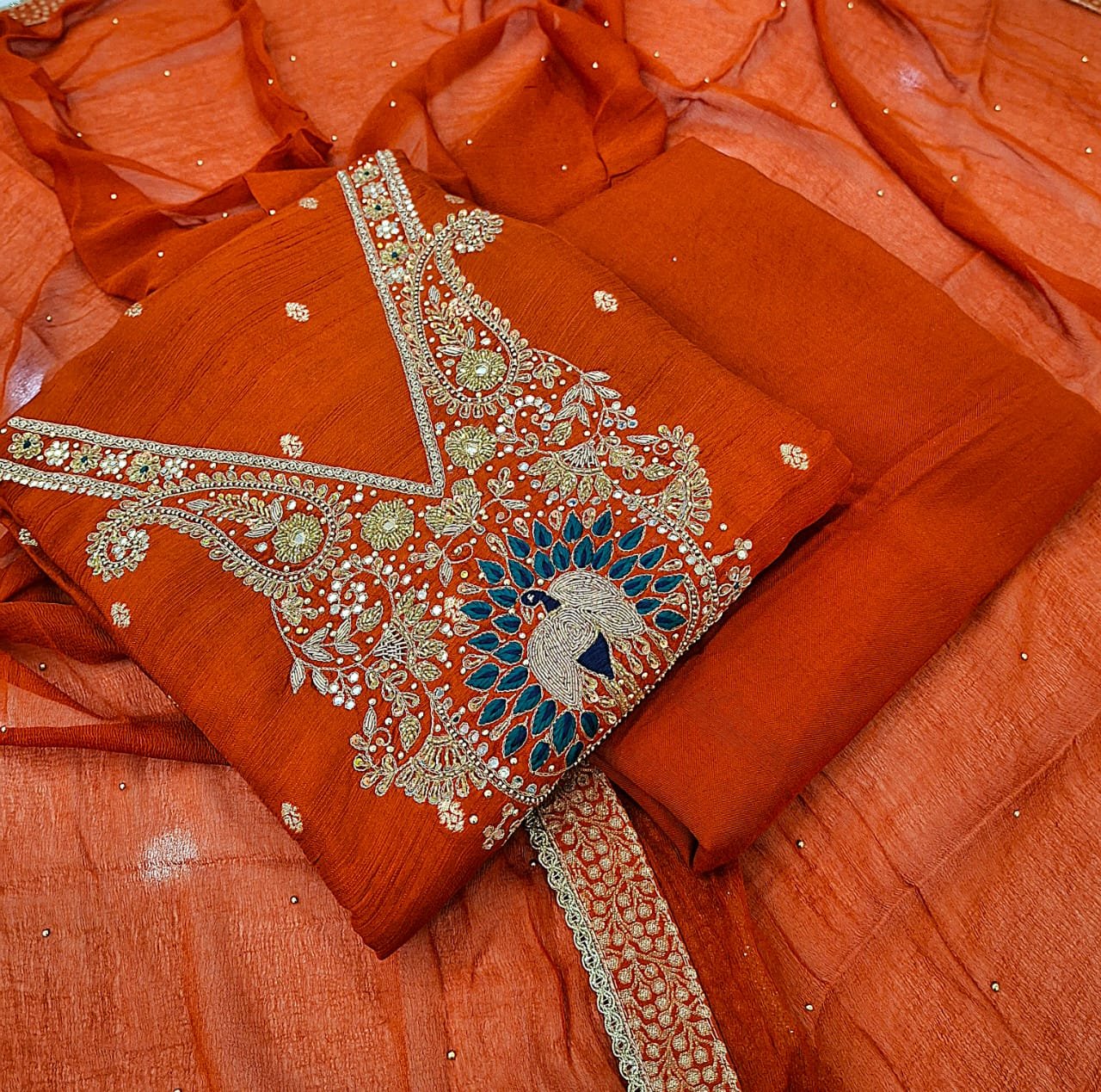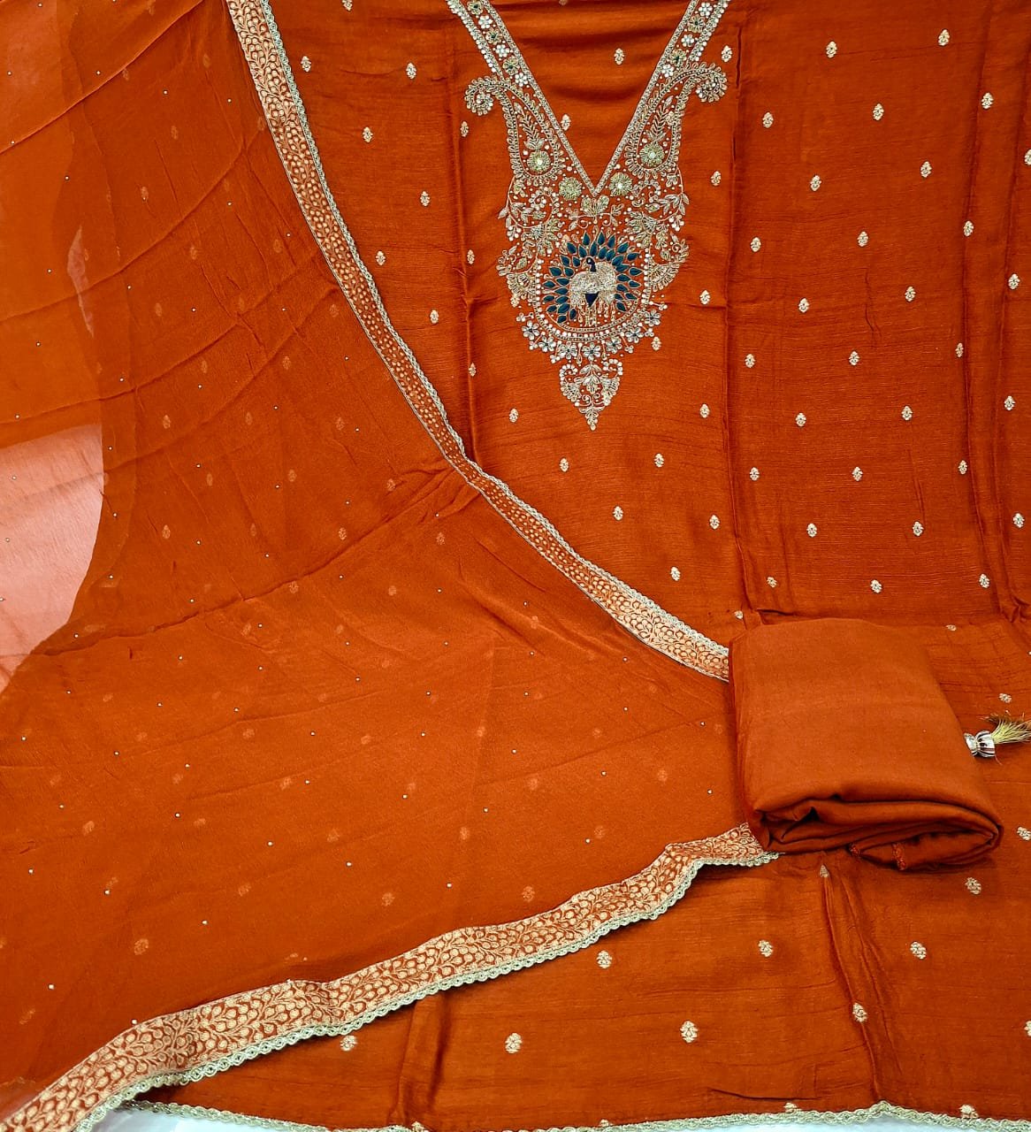 Pure silk fabric neck kundan embroidery work and hand embroidery work suit with chiffon dupatta and plane bottom.