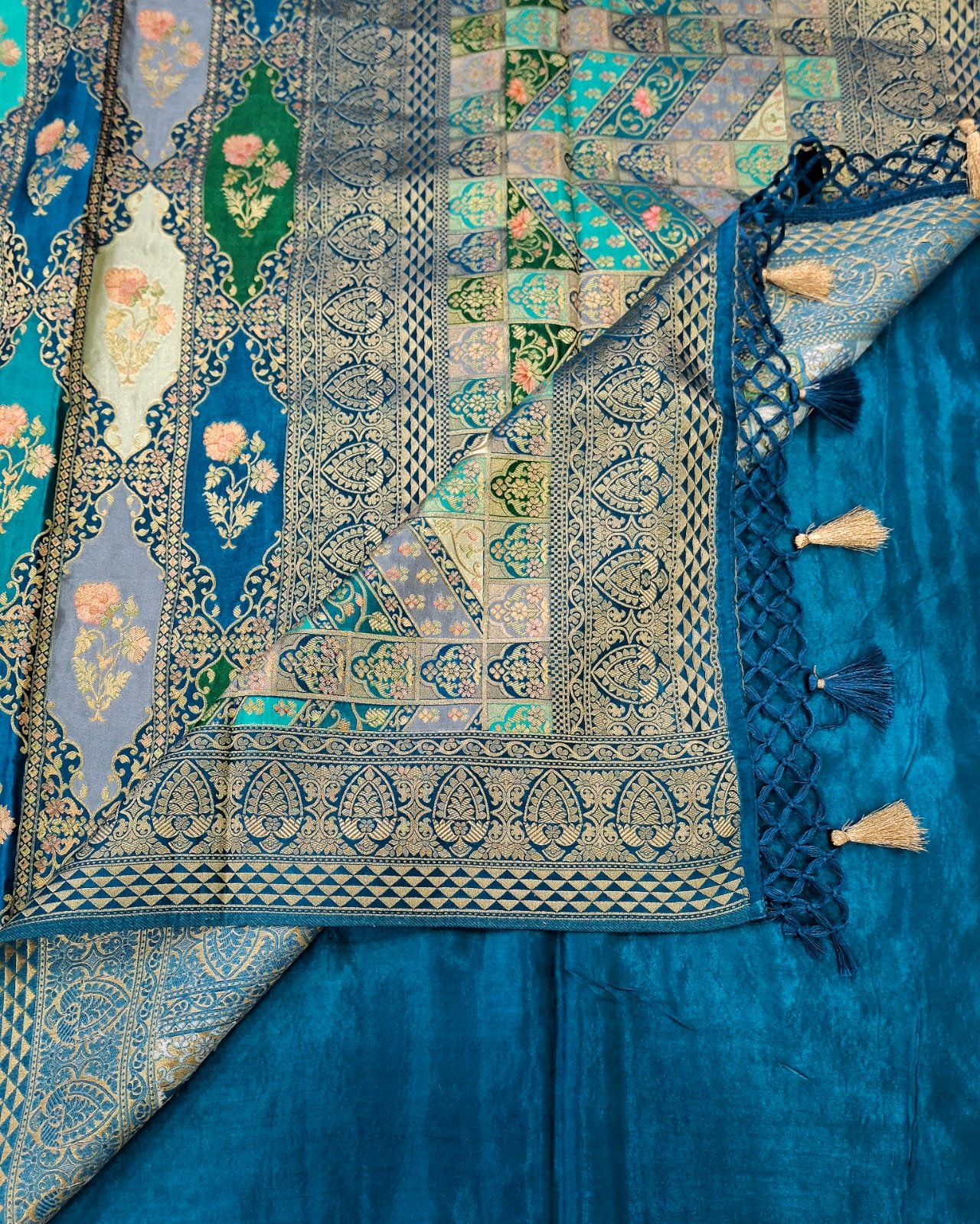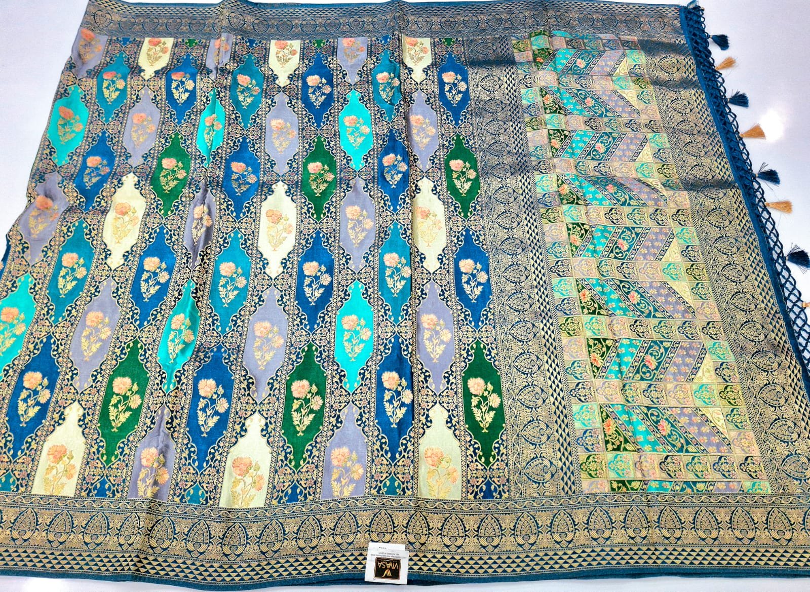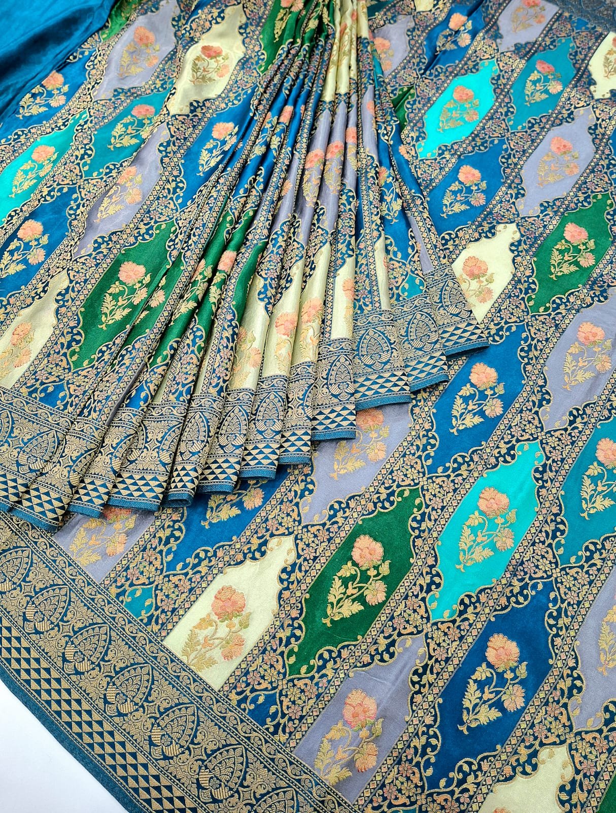 Pure satan silk designer zardozi + jacquard + resham + ivory weaving saree with rich pallu.