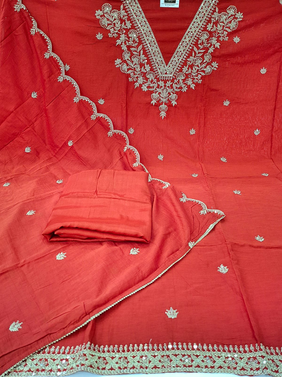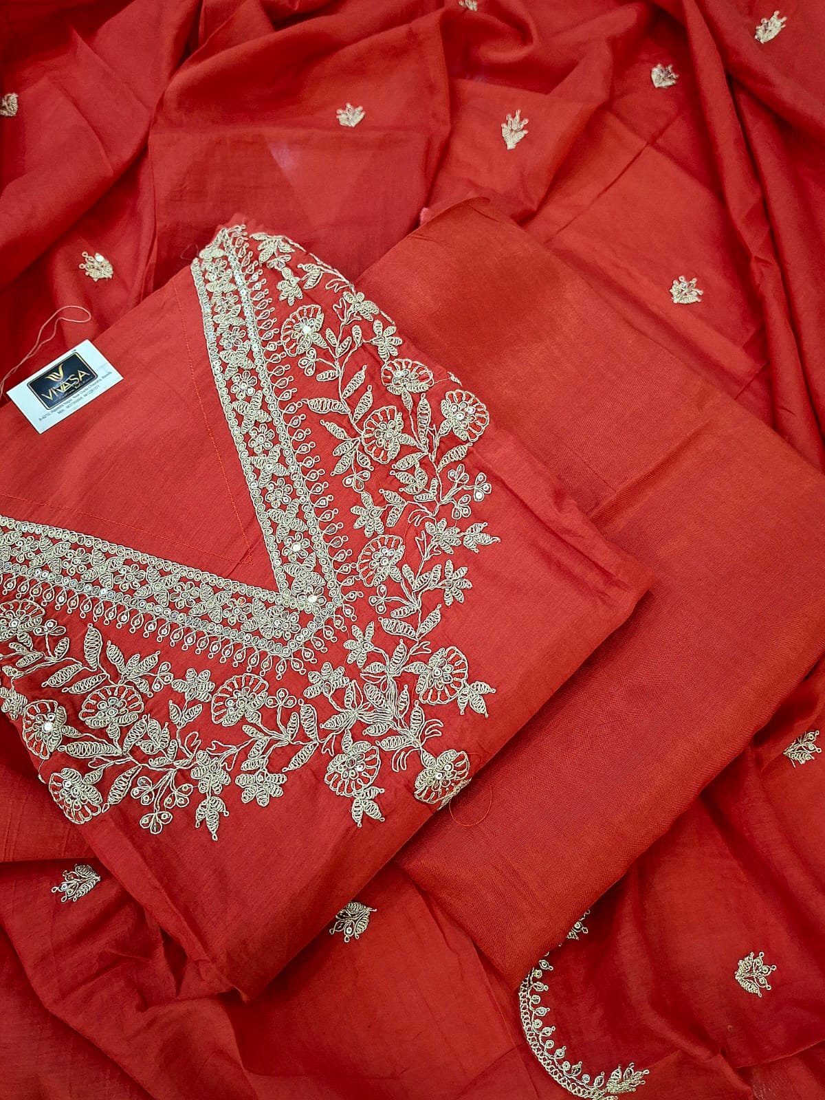 Hot Red Neck embroidery Silk Suit with fancy embroidery silk dupatta and plane bottom.