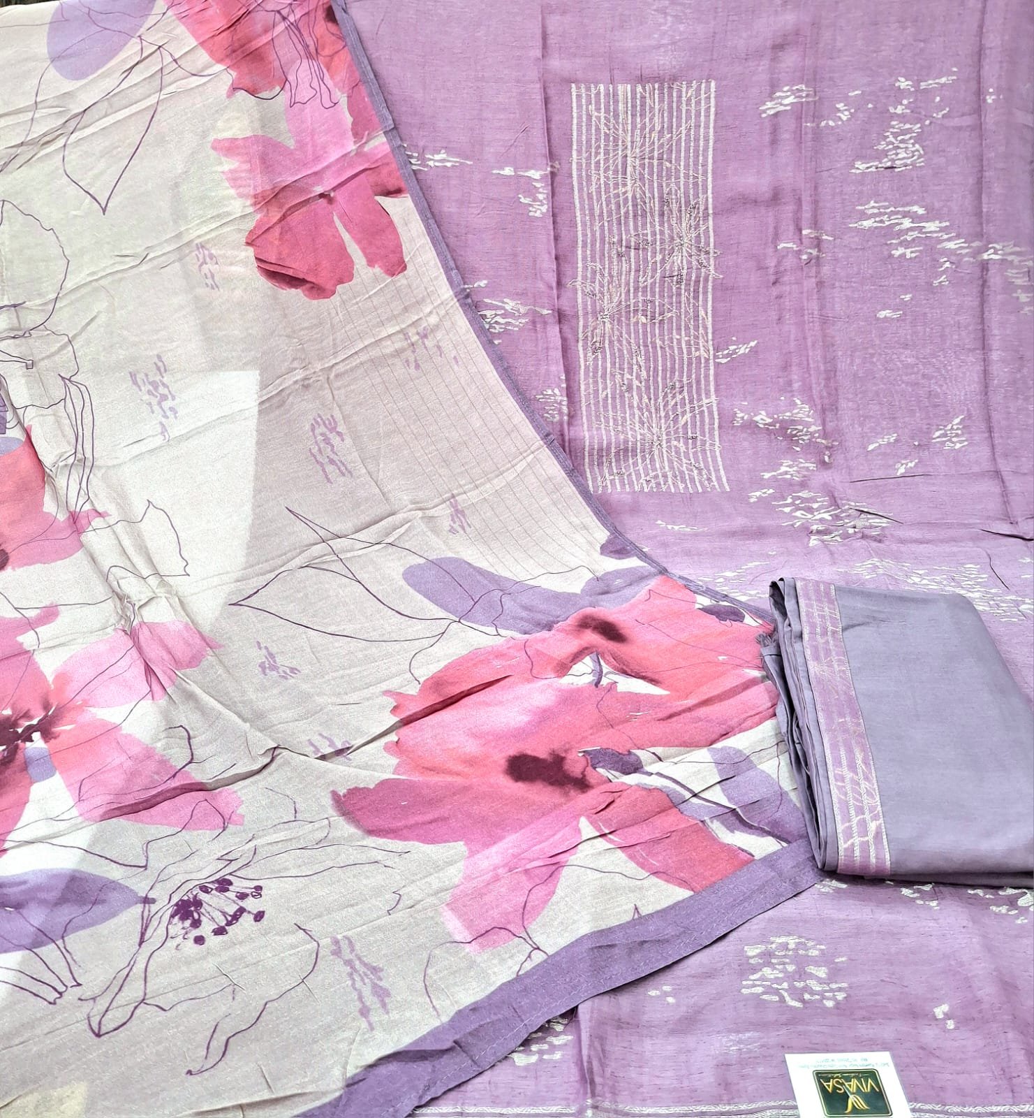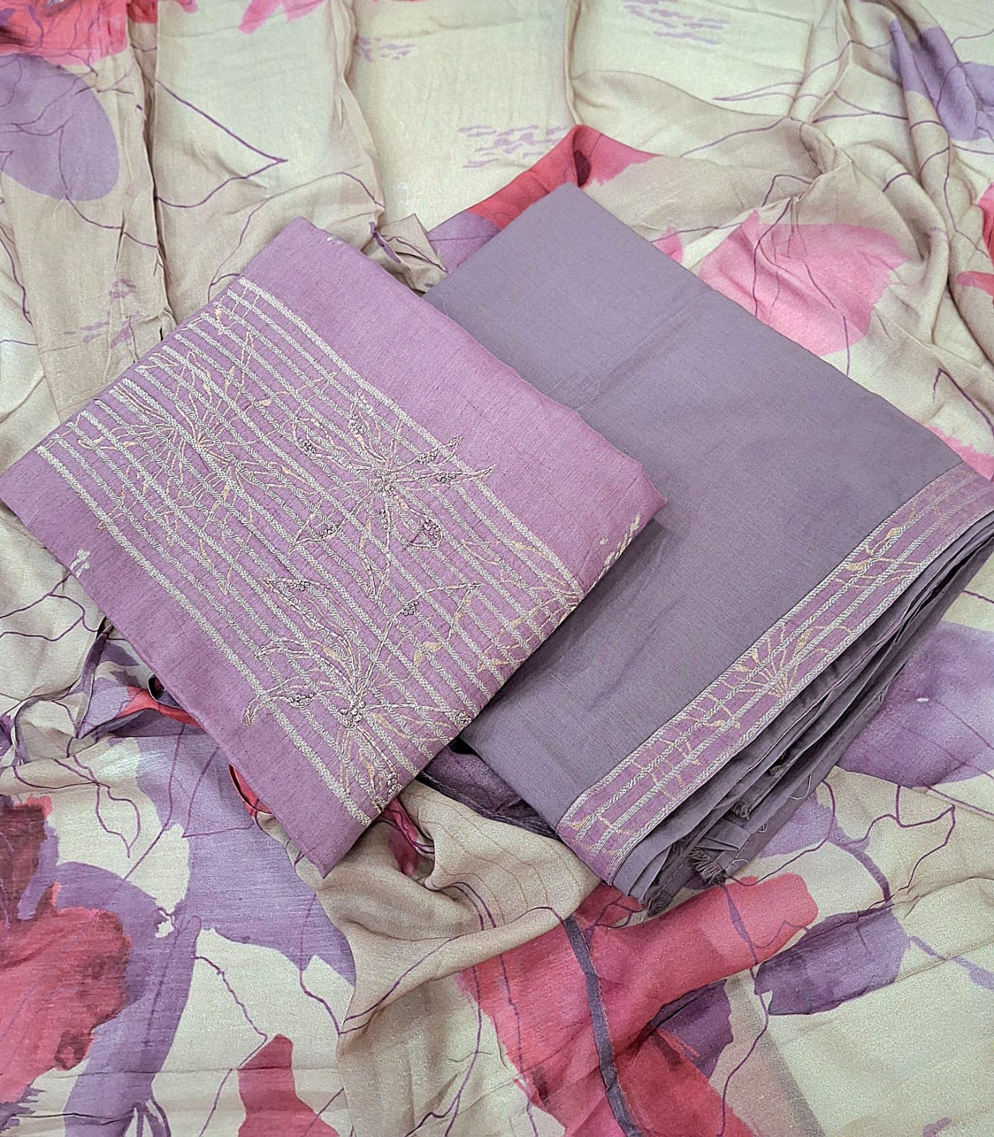 Designer silk ivory embroidery suit with patch work with cotton bottom and printed silk dupatta.