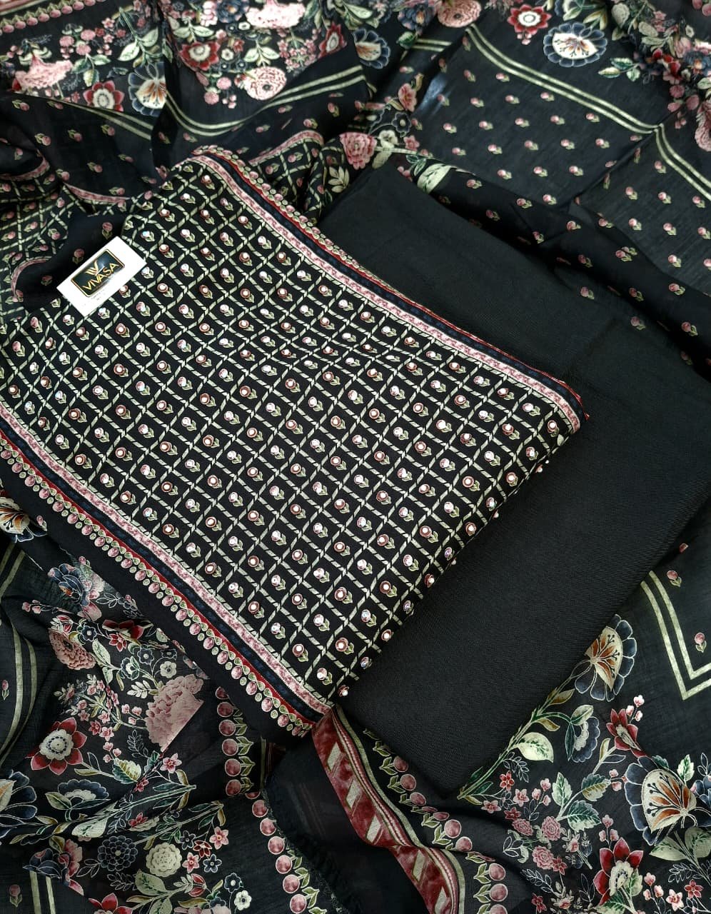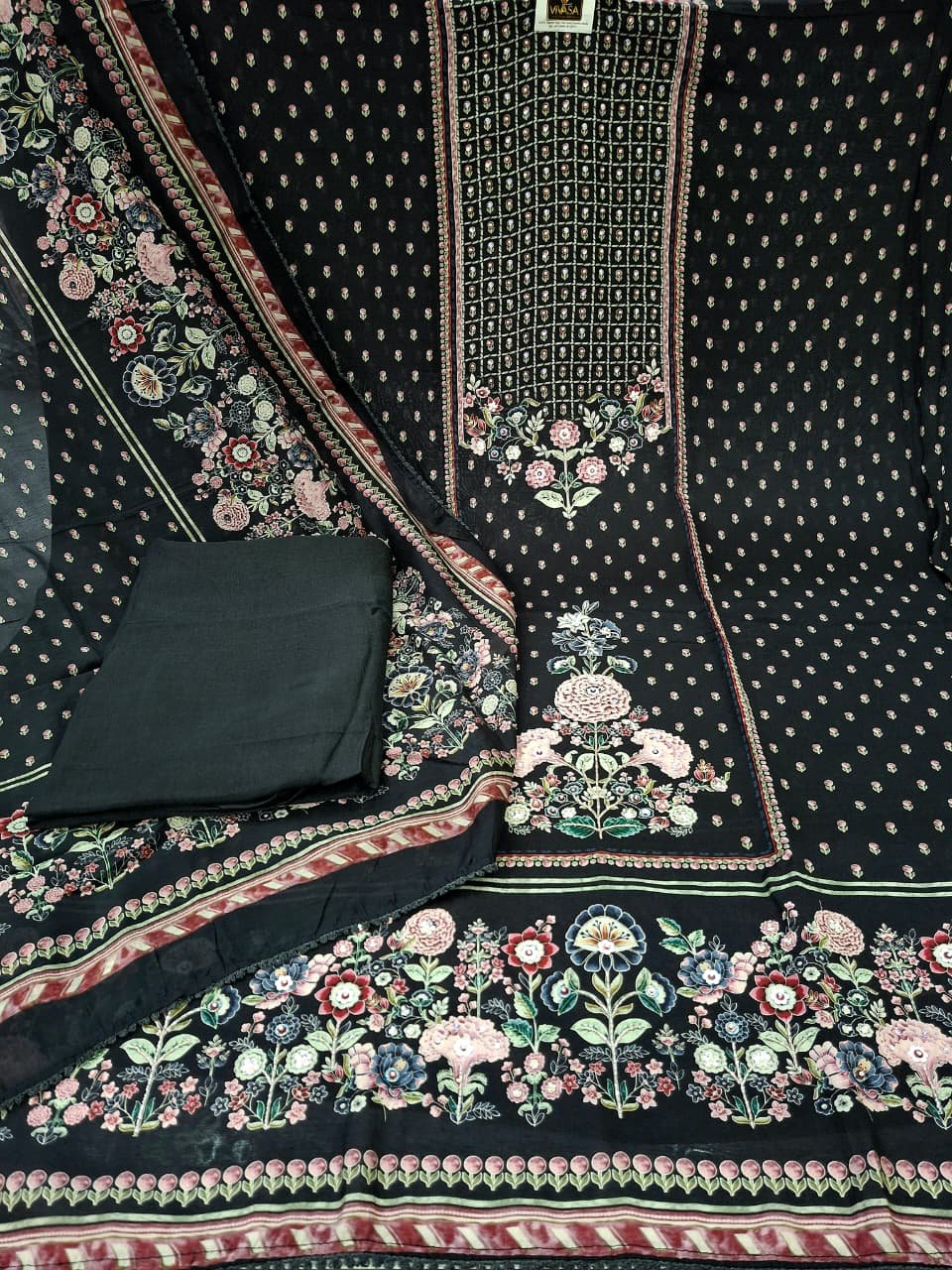 Designer Silk printed black suit with fancy dupatta and plane bottom.