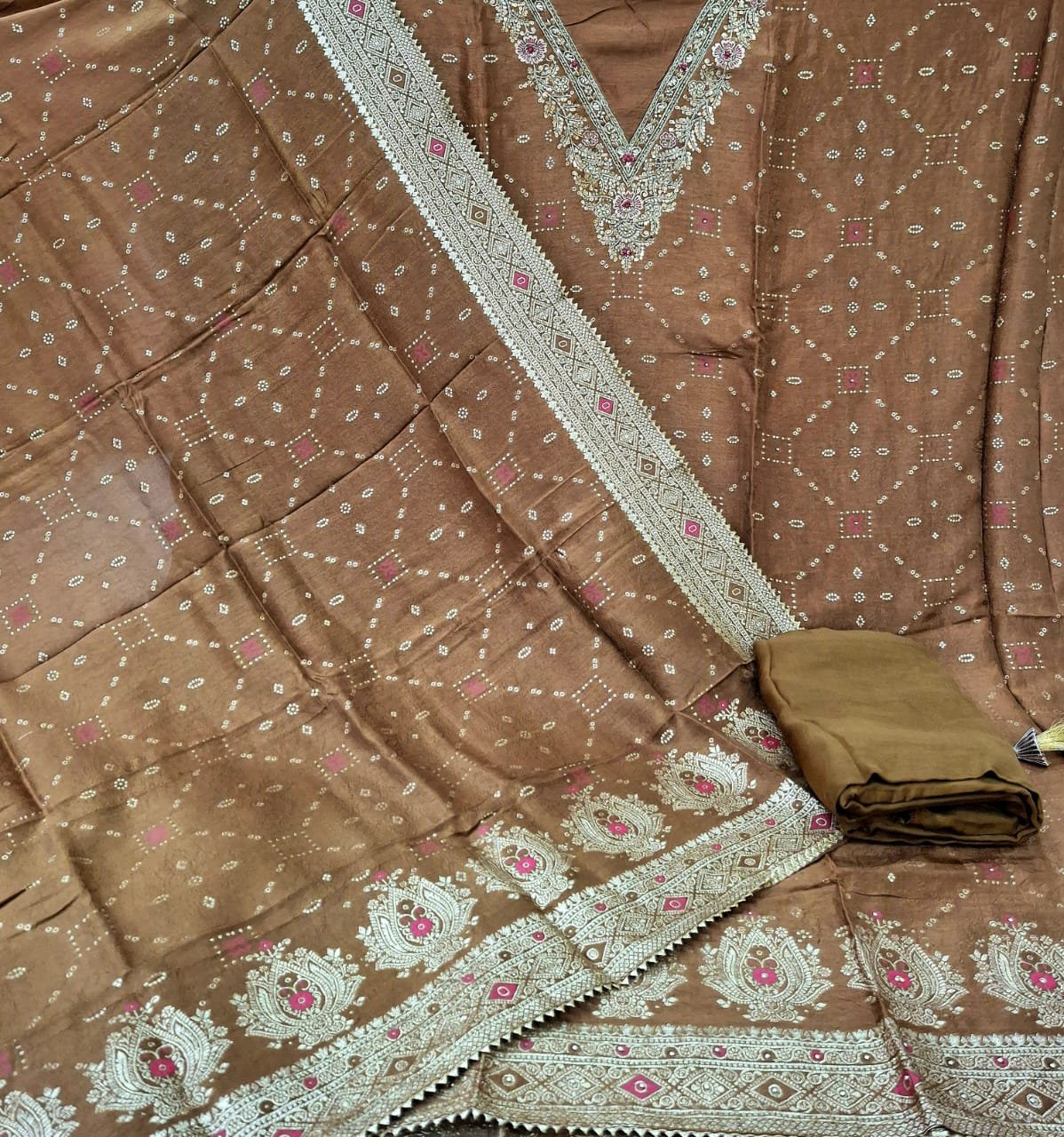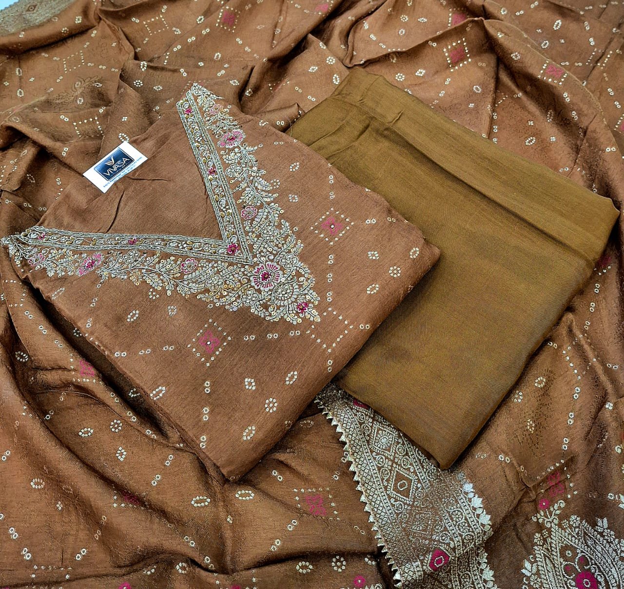 Silk suit with V style embroidery work neck with weaving pattern on full suit with silk dupatta and plane bottom.