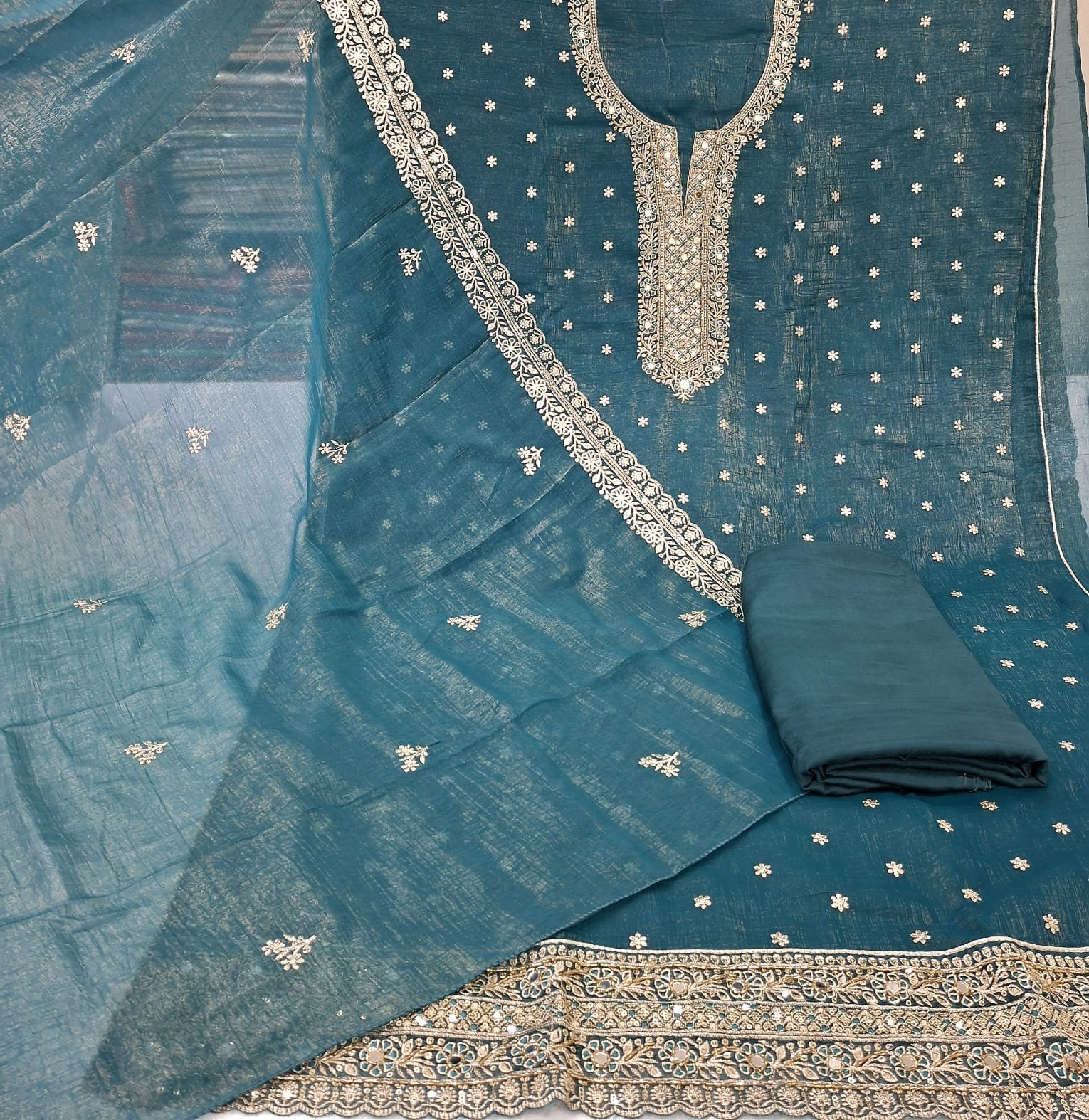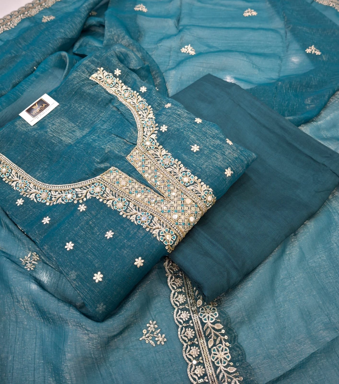 Tissue silk fabric embroidery design and mirror work suit with tissue silk dupatta and plane bottom.