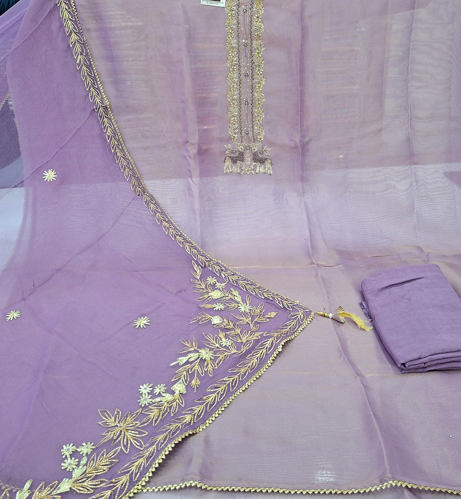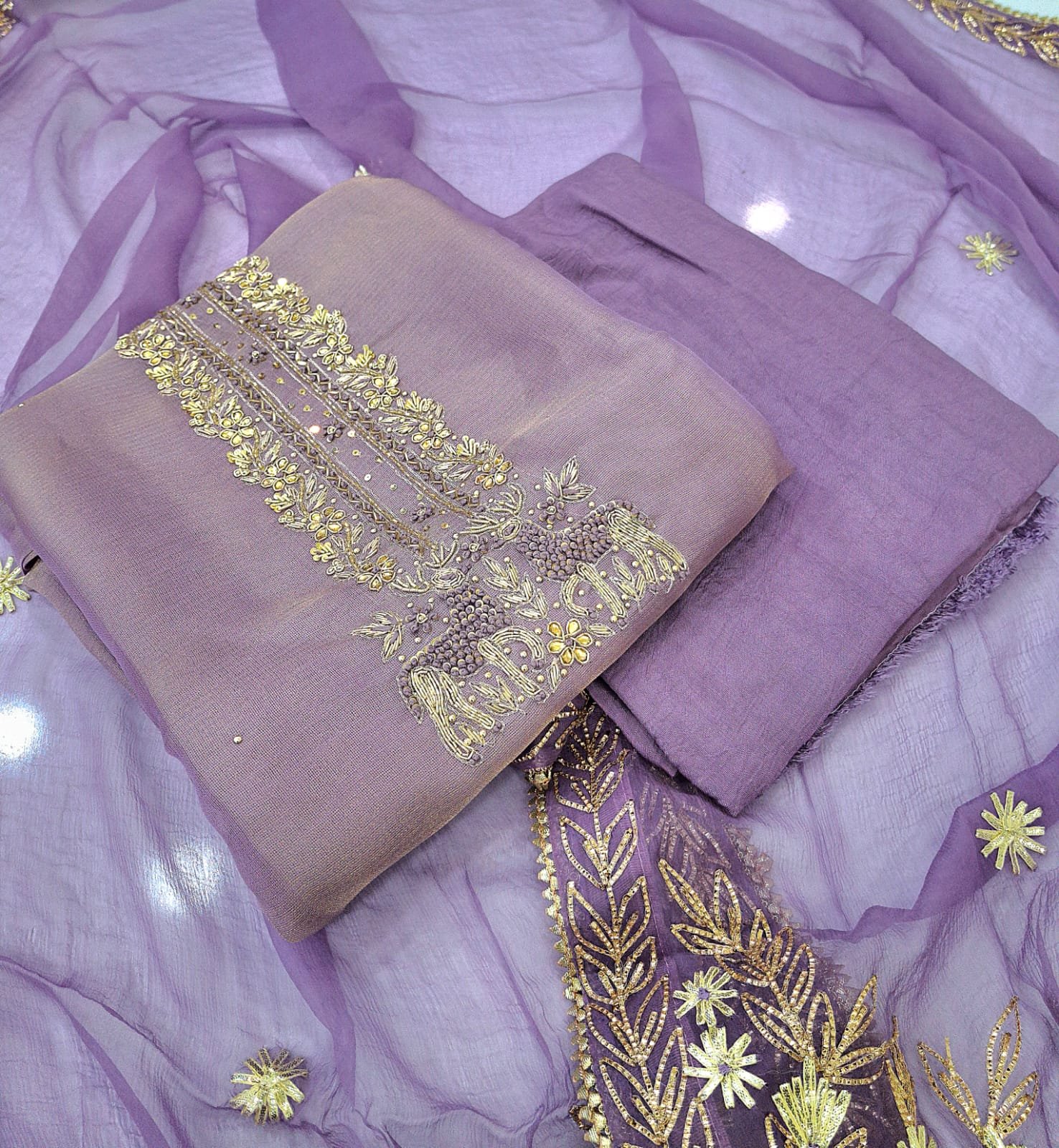 Tissue silk fabric neck hand embroidery design suit with sober concept with designer gota patti work dupatta and plane bottom.