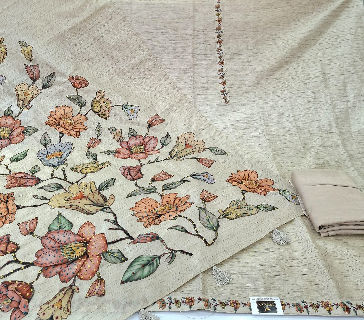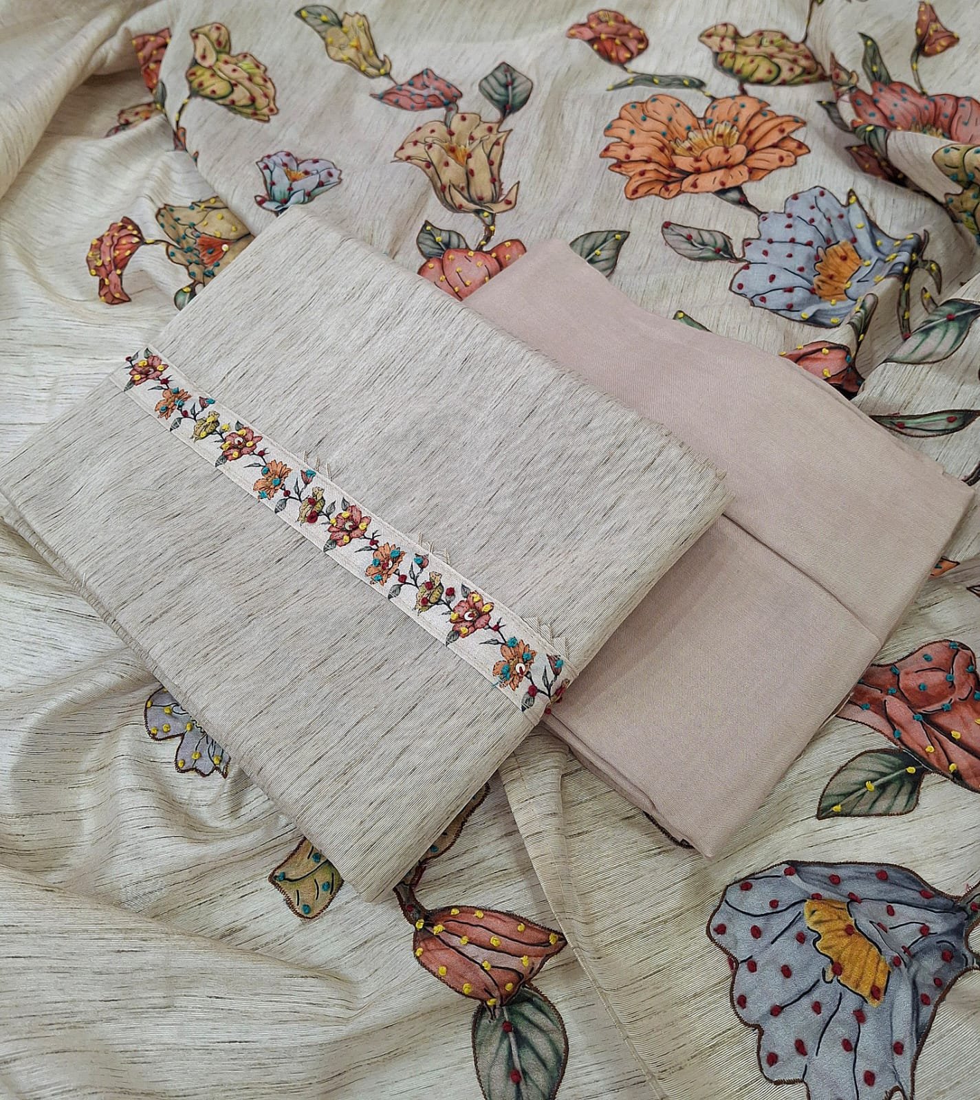Tussar silk fabric texture based suit with plane bottom and tussar silk patch work and kantha work dupatta.