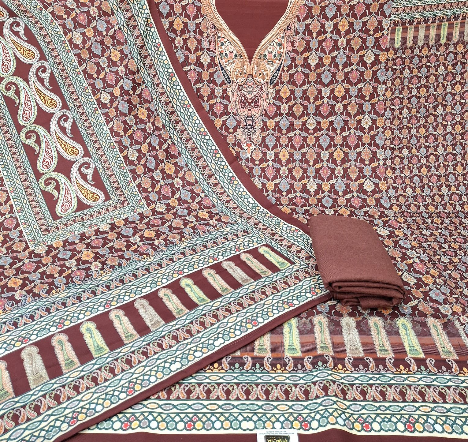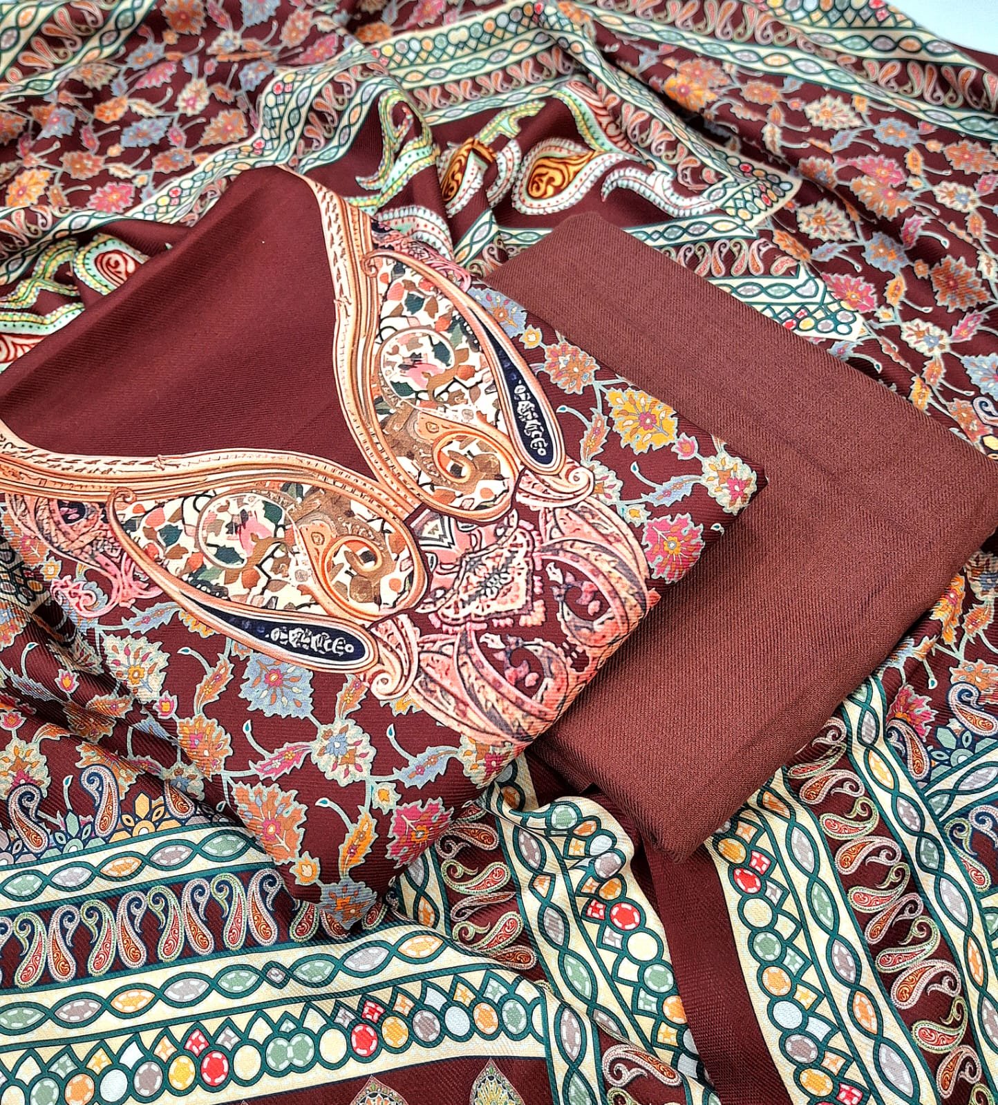 Semi Pashmeena printed woollen suit with woollen bottom and printed shawl.